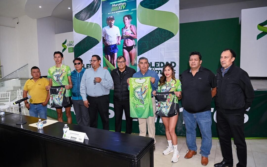 La carrera atlética Marathón TV 2025 se realizará este sábado 14 y domingo 15 de noviembre, contará con carreras de 5 y 10 kilómetros, categorías infantiles y juveniles, así como la participación de atletas élite provenientes de diversos países; la playera oficial, de color verde y con motivos prehispánicos y nacionales, luce un colibrí al centro y el logotipo de la administración municipal de Soledad de Graciano Sánchez, símbolo del compromiso constante de este gobierno con el deporte y la promoción de la identidad cultural.