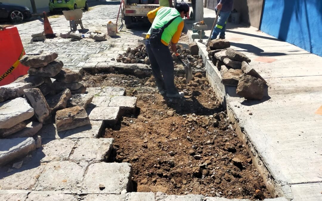 Esta semana, en la colonia Burócrata, se llevan a cabo trabajos de retiro y reposición de adoquines sobre la Avenida Estatuto Jurídico, con el objetivo de conservar la imagen urbana y garantizar una superficie adecuada para el tránsito. En esta misma zona, se atienden cuatro reportes para reparar baches en la calle Salubridad, atendiendo daños acumulados por la temporada de lluvias.