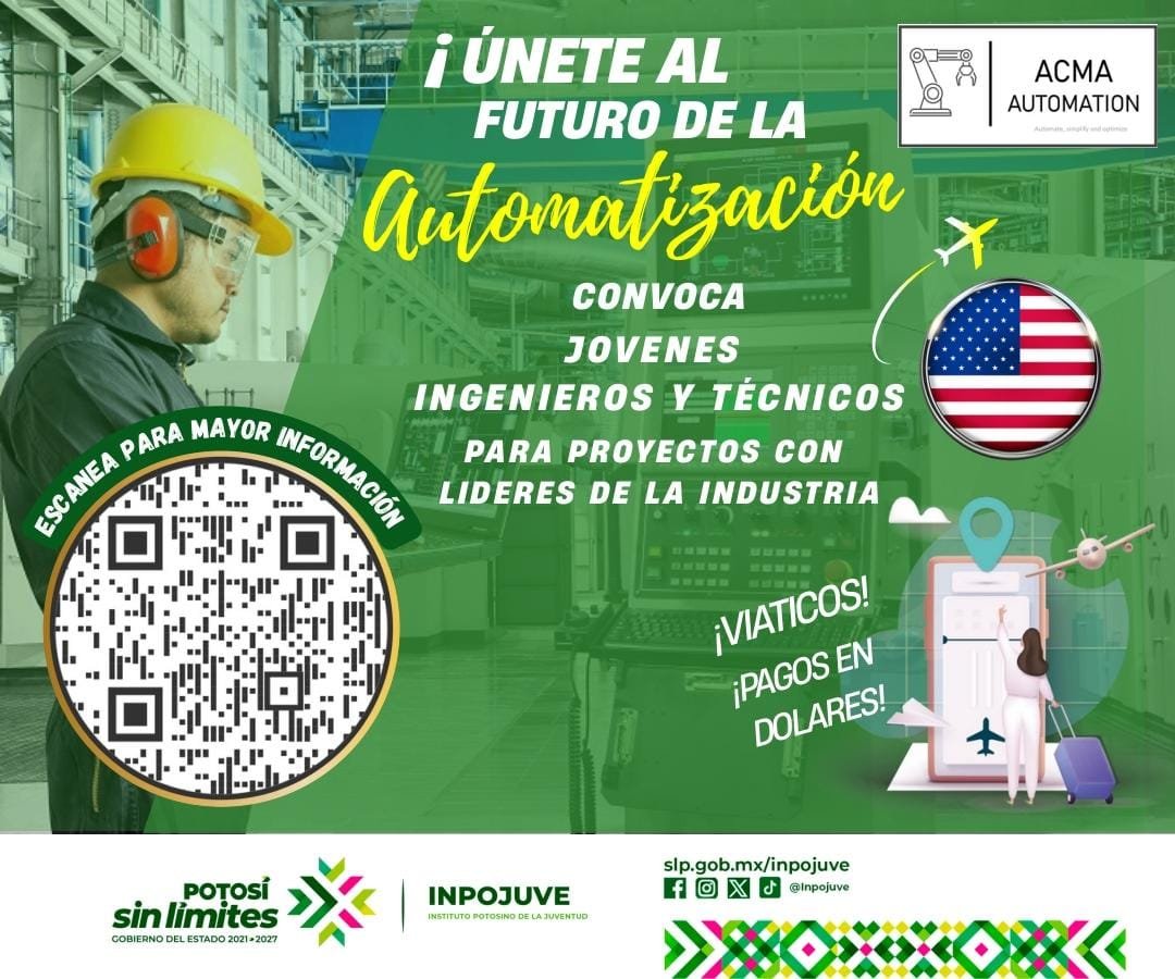 El Instituto Potosino de la Juventud (Inpojuve) en la región Huasteca lanzó una convocatoria dirigida a jóvenes ingenieros y técnicos electromecánicos interesados en incorporarse a proyectos internacionales en Estados Unidos. Con el respaldo del Gobernador Ricardo Gallardo Cardona y en coordinación con la empresa ACMA Automation, esta iniciativa busca abrir oportunidades laborales especializadas en compañías líderes del sector automotriz.