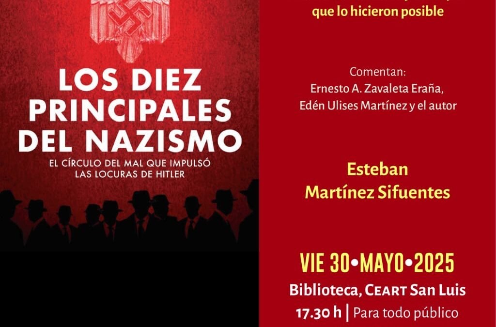 «Los diez principales del nazismo. El círculo del mal que impulsó las locuras de Hitler» es un libro escrito por el potosino Esteban Martínez Sifuentes, el cual será presentado este próximo viernes 30 de mayo a las 17:30 horas en la Biblioteca del Centro de las Artes de San Luis Potosí (CEART SLP).
