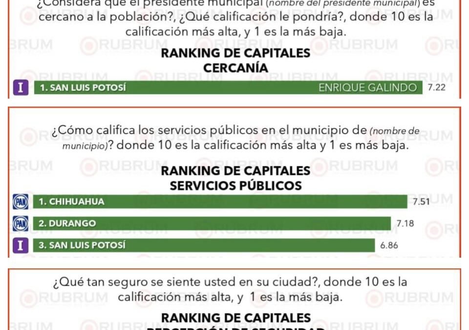La empresa Rubrum, en su evaluación ciudadana en 31 capitales estatales correspondiente a junio de 2025, posicionó al Presidente Municipal Enrique Galindo Ceballos en el primer lugar gracias a la alta calificación de 7.50, otorgada por la población, debido a su trabajo y desempeño como Alcalde de la Capital potosina.