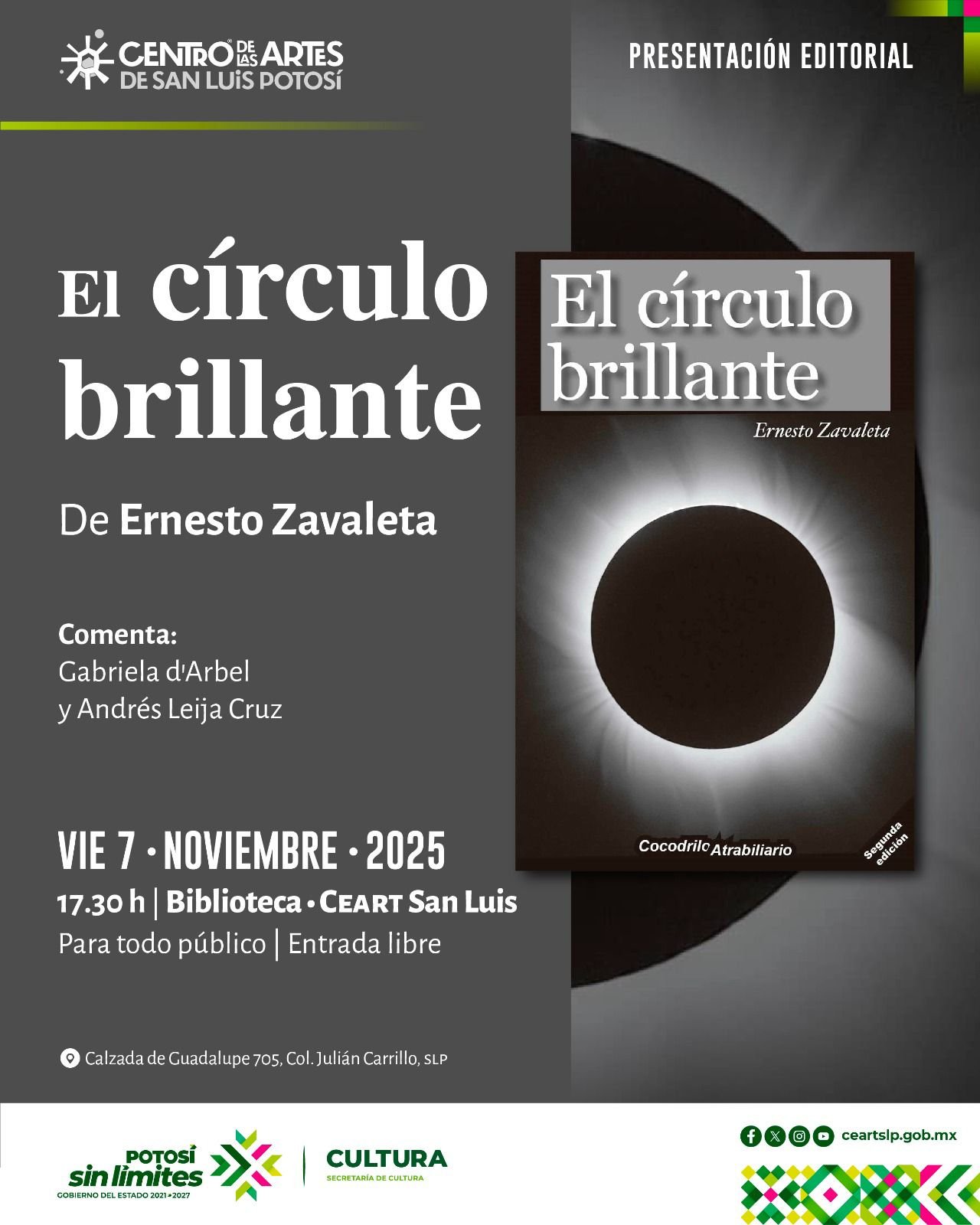 El Centro de las Artes de San Luis Potosí (CEART SLP) invita al público a la presentación editorial de El Círculo Brillante, obra del escritor Ernesto Zavaleta Eraña, este viernes 7 de noviembre a las 17:30 h en la Biblioteca del CEART San Luis.