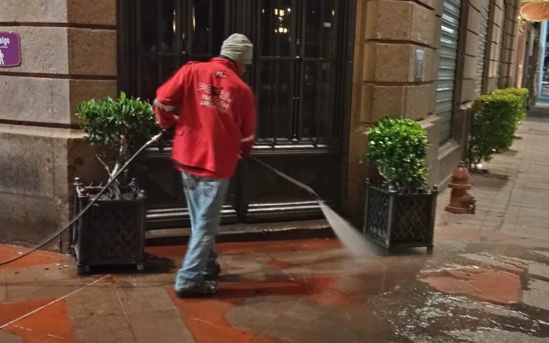 Esta intervención, realizada por la Coordinación de Imagen Urbana, forma parte de una estrategia para mantener en óptimas condiciones las áreas de mayor afluencia peatonal, eliminando residuos, manchas y bacterias que se acumulan por el constante tránsito diario.