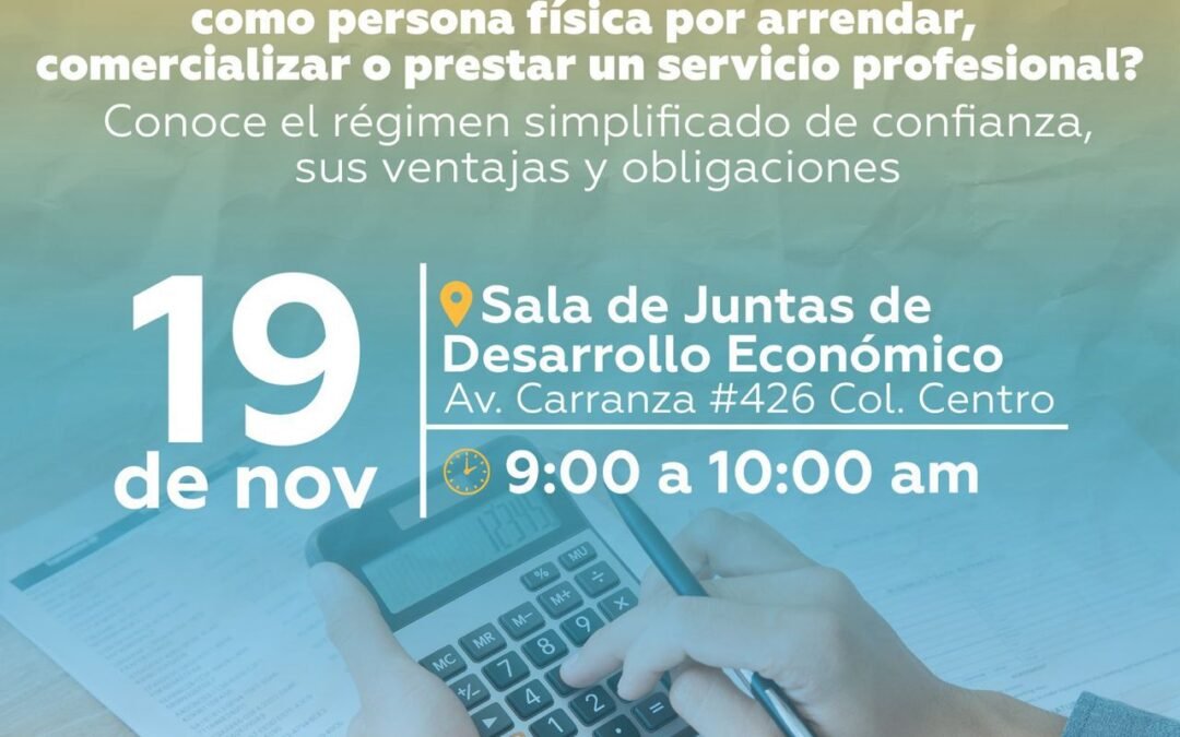 El Gobierno Municipal de San Luis Potosí, a través de la Dirección de Desarrollo Económico, invita a emprendedores, profesionistas y ciudadanos interesados a participar en la capacitación “¿Quieres darte de alta en Hacienda y tributar como persona física? Conoce el Régimen Simplificado de Confianza, sus ventajas y obligaciones”, con el objetivo de brindar herramientas claras para el cumplimiento fiscal.
