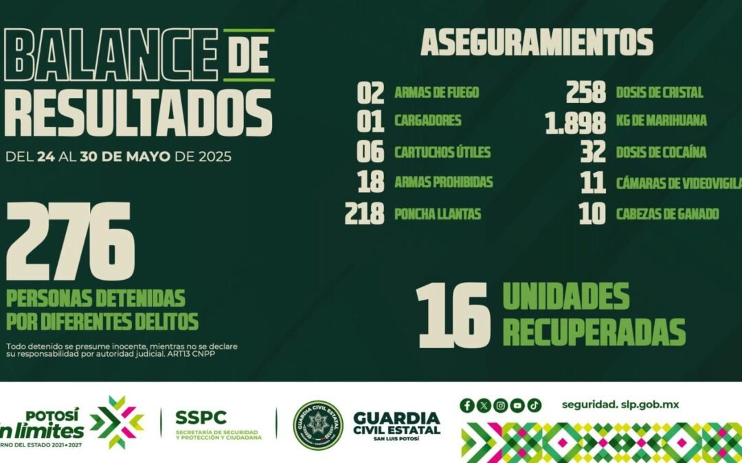 S.L.P.- Como resultado de los trabajos enfocados en garantizar la paz en las cuatro regiones del territorio potosino, agentes de la Guardia Civil Estatal (GCE) detuvieron a 276 personas, por la probable comisión de diferentes hechos ilícitos, derivado de los trabajos preventivos.