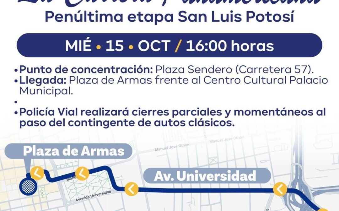 La tradicional Carrera Panamericana llegará mañana a San Luis Potosí, consolidando al municipio como una de las sedes importantes de esta competencia internacional. Se trata de la cuarta vez que el Gobierno de la Capital, encabezado por el Alcalde Enrique Galindo Ceballos, atrae el evento como parte de la estrategia de atracción turística y deportiva.