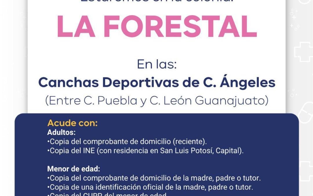 Por lo anterior este 10 de junio, La Ruta de la Salud 2.0 brindará atención en la colonia La Forestal, un horario de 09:00 a 13:00 horas. Para acceder a los servicios, los adultos deben presentar copia de comprobante de domicilio reciente y copia del INE con residencia en San Luis Potosí Capital. En el caso de menores de edad, se solicita comprobante de domicilio de la madre, padre o tutor, identificación oficial y CURP del menor.