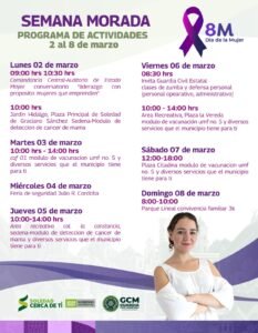 Del 2 al 8 de marzo se desarrollarán actividades dirigidas a mujeres, niñas y adolescentes del municipio, con el objetivo de...