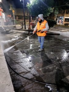 Con equipo de hidrolavado, personal del Ayuntamiento hace limpieza a fondo de los andadores interno y externo. Con la...
