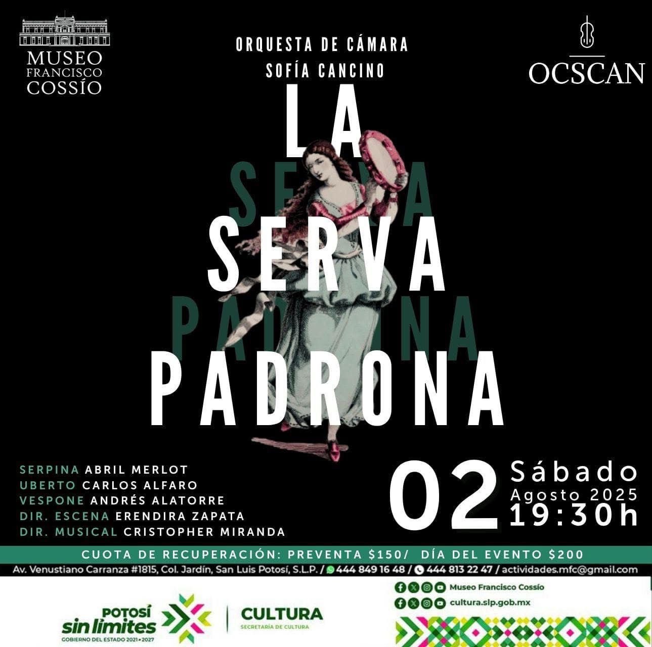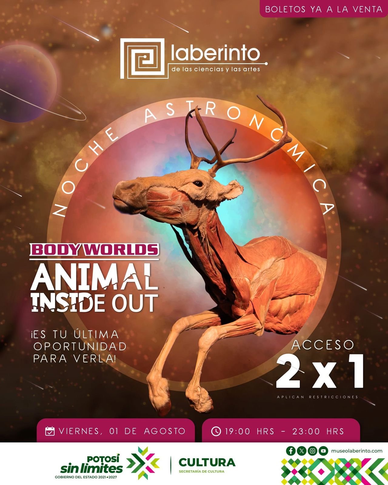 El viernes 1 de agosto destaca la Noche Astronómica en el museo Laberinto desde las 19:00 horas, con observación de estrellas, talleres, música y promoción especial para conocer la exposición Body Worlds Animal Inside Out. Ese mismo día inicia la Feria Regional del Rebozo en Santa María del Río con actividades culturales, música y tradición. El sábado 2, en el Parque Tangamanga I, se realizará la rodada nocturna Rodando con Causa a las 19:30 horas. También habrá orquesta con la presentación de La Serva Padrona en el museo Francisco Cossío a las 19:30 horas y en el museo de la Máscara una Noche Bohemia las 20:00 horas. Todos los sábados habrá recorridos guiados en el Museo Federico Silva a las 12:00pm y funciones de cine en la Cineteca Alameda. Durante el sábado y domingo se llevará a cabo el Otak-On en el Centro de Negocios Potosí con invitados nacionales e internacionales, cosplay, torneos y más.