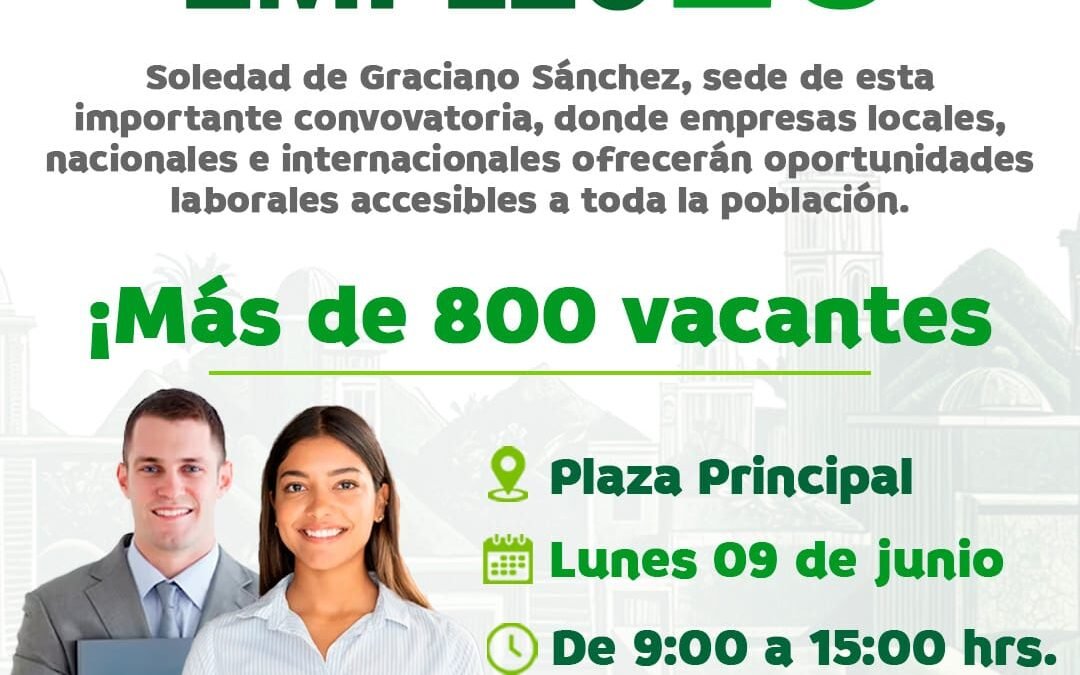 Con más de 40 empresas participantes y más de 800 vacantes disponibles, Soledad de Graciano Sánchez será sede de la Feria Nacional del Empleo, la más importantes del estado potosino, gracias al impulso del Alcalde Juan Manuel Navarro Muñiz; será este lunes 9 de junio, cuando la Plaza principal se convertirá en un punto de encuentro entre buscadores de empleo y empresas formales, en un esfuerzo conjunto con la Secretaría del Trabajo del Estado y el Gobierno Federal, como parte de las acciones del Plan Municipal de Desarrollo para fortalecer la economía de las familias soledenses.
