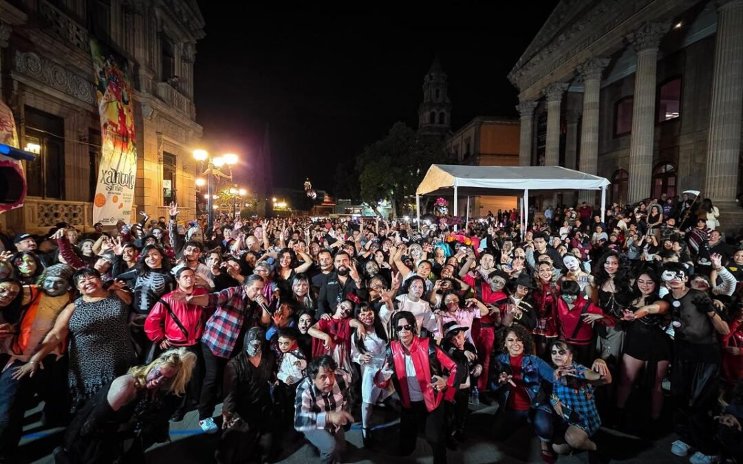 Miles de niñas, niños, jóvenes y adultos se sumaron a esta colorida coreografía que transformó el Centro Histórico en un escenario lleno de energía, creatividad y talento potosino. Disfrazados como zombis y personajes emblemáticos del clásico musical, los participantes dieron vida a un espectáculo que fortaleció la convivencia social y el orgullo cultural de San Luis Potosí.