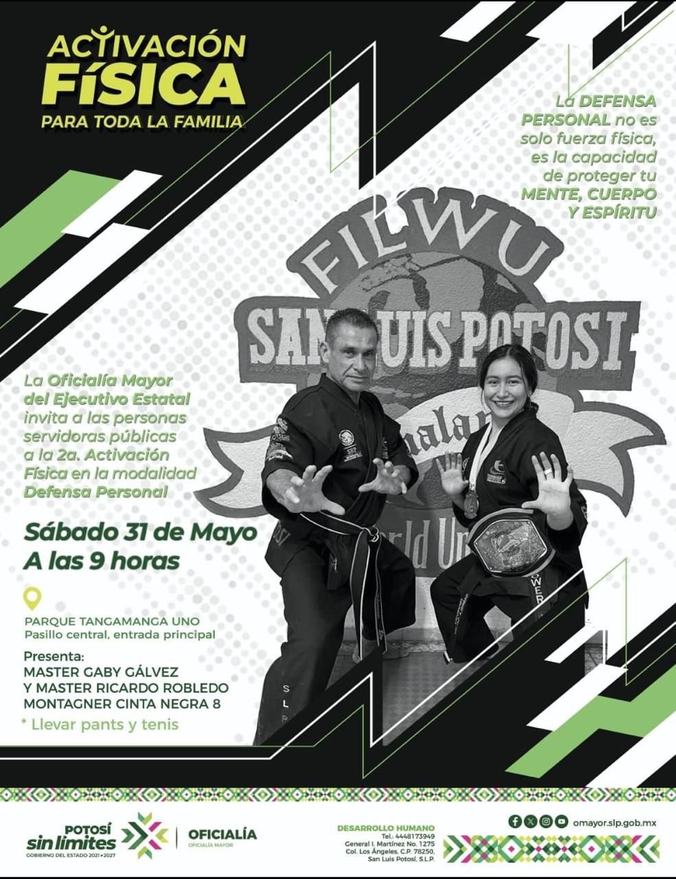 La Oficialía Mayor (OM) del Poder Ejecutivo del Estado realizará la segunda activación física del año para las y los servidores públicos y sus familias el próximo sábado 31 de mayo a las 9:00 horas en el pasillo central del parque Tangamanga I de forma gratuita en la modalidad de defensa personal.
