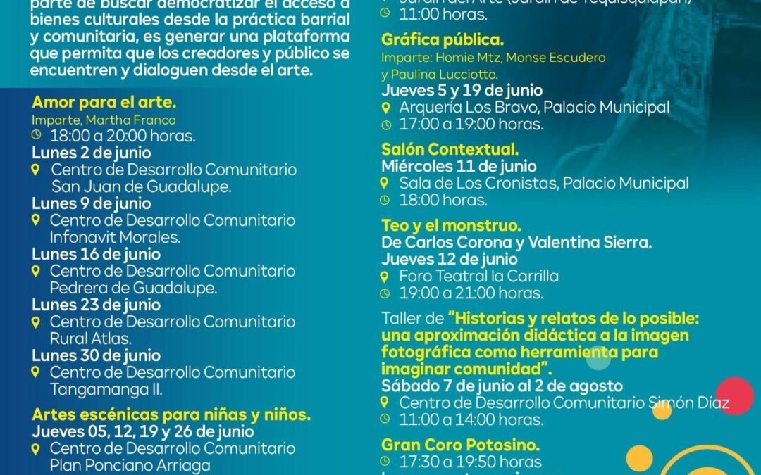 “Tenemos el taller por el Amor al Arte, impartido por la artista Martha Franco; Artes escénicas para niños e infancias; el taller de gráfica pública que se realiza en el centro histórico; el fomento de la lectura con Letras Rodantes que se hará en plazas públicas; la formación del Coro Polifónico Oralia Domínguez, entre otras actividades que se tienen”, indicó el responsable de Cultura Municipal.